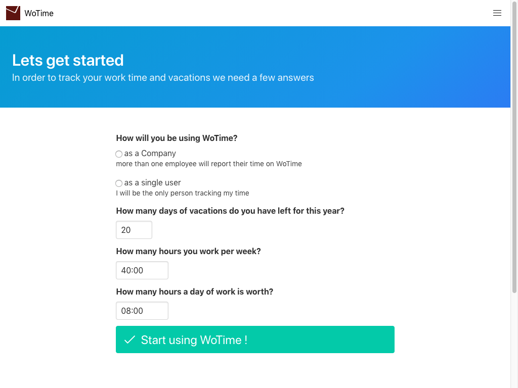 WoTime requires no installation, works from your desktop computer browser and from your mobile phone. Creating an account for your company takes less then five minutes.